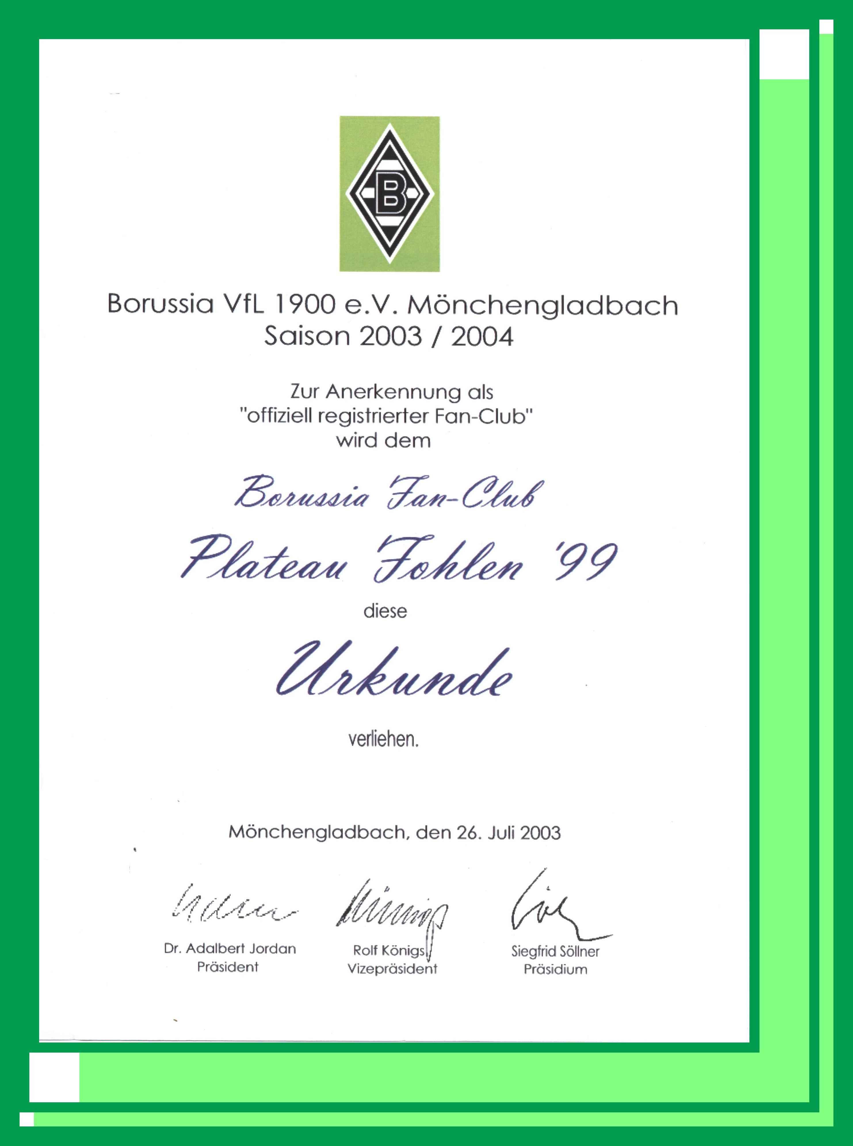 aber es sollte noch bis zum 26.07.2003 dauern, bis er offiziell bei Borussia als solcher angemeldet/ an- erkannt wurde (s. untenstehende Urkunde u. auch den Bericht des “Trierischer Volksfreund”).